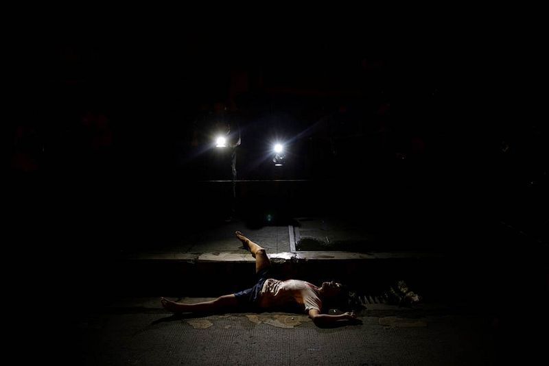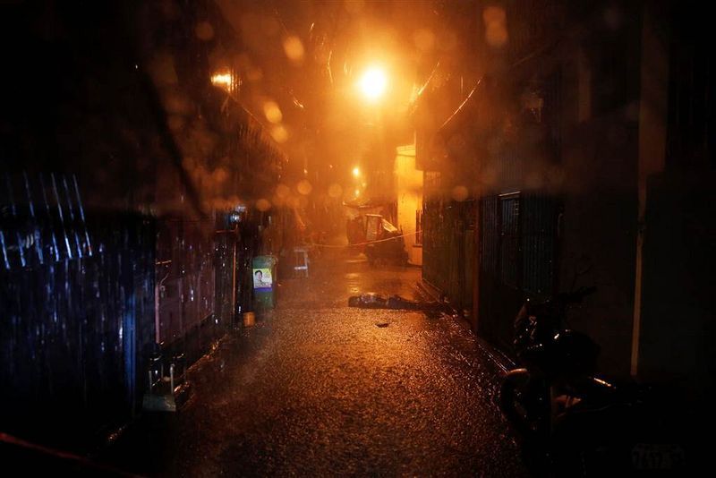 傾盆大雨中,在一個窄巷內,躺著一名男子的屍體。他是被一名身分不明、騎著摩托車的槍手所殺死。(2016年10月11日,馬尼拉)