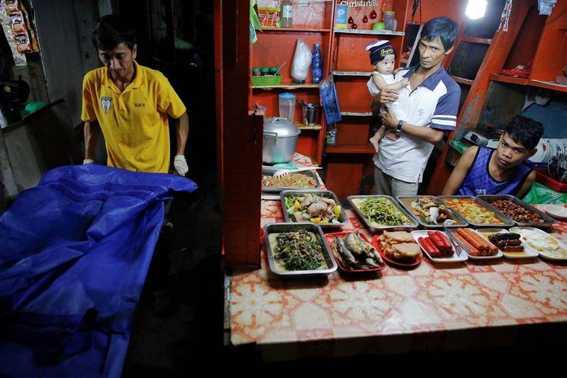 在港口的一個貧民窟裡,一名小販抱著一個嬰孩,看著葬儀社的工人把屋內的2個屍體中的一個先行抬走。(2016年10月21日,馬尼拉)