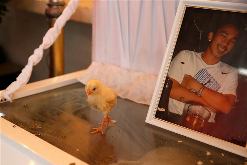 22歲的三輪車車伕Eric Sison的屍體,躺在貧民窟的一副棺材裡。據當地官員說,他是在警察到帕塞市(Pasay)尋找毒品推銷員時被殺。(2016年8月29日,馬尼拉,帕塞市)