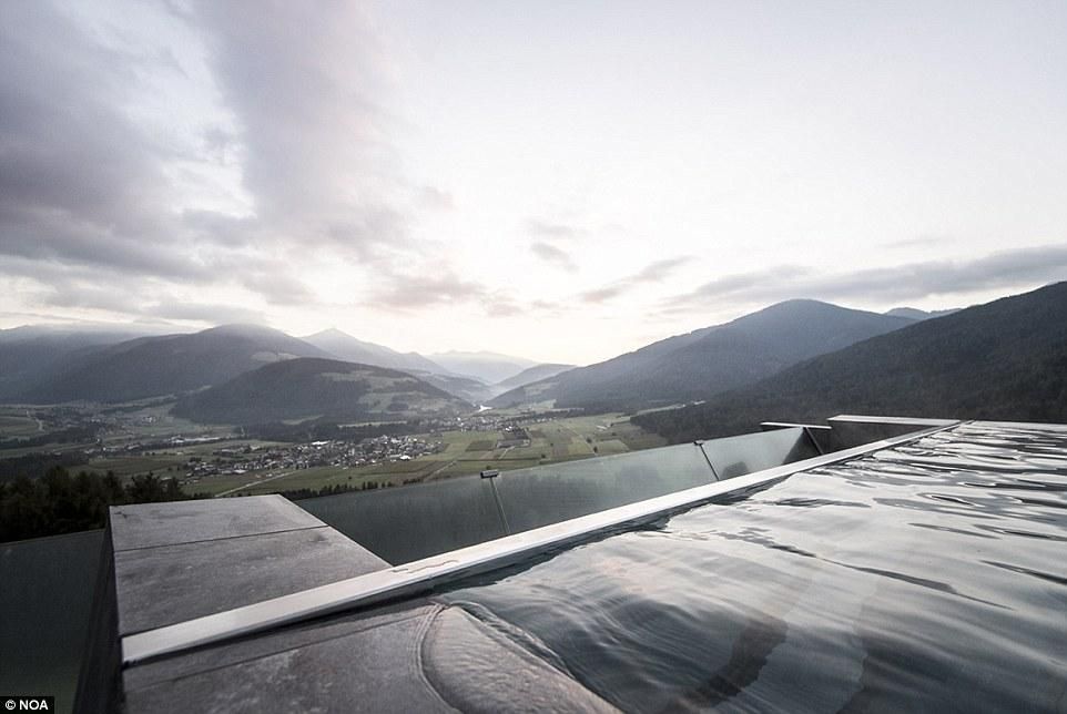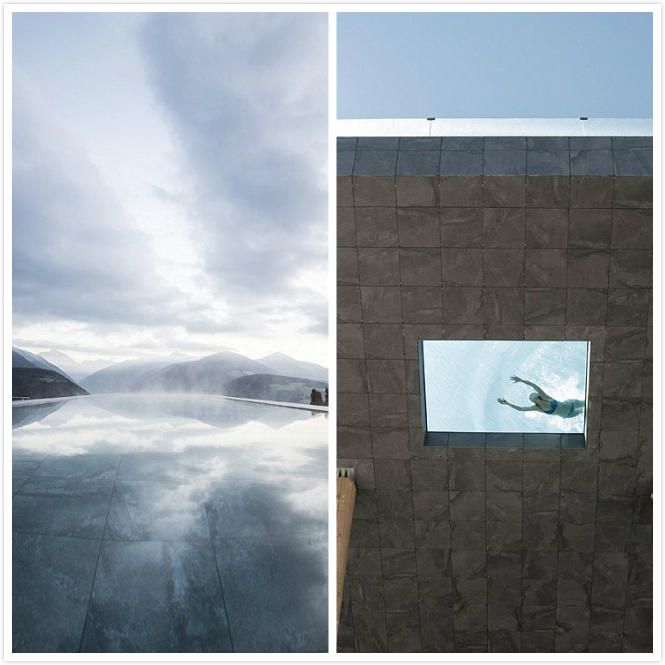 據《每日郵報》報道,在意大利南蒂羅爾(South Tyrol)的一家酒店內,新擴建的游泳池位於酒店露台,距離地面40英尺(約12.2米)高,池底部分使用玻璃面板,在泳池內可以俯瞰整個雪山