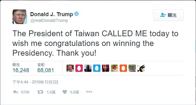 川普推特發文:台灣總統今天致電給我,恭賀我當選總統,謝謝你。
