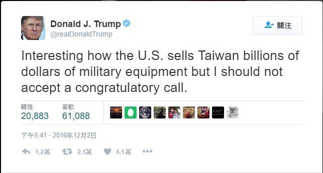 川普第二篇推特發文:美國軍售台灣上百億,為何我不能接台灣總統的賀電?