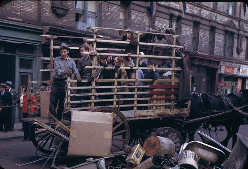 下東區(Lower East Side)的街道上,有收舊貨的車子,也有載人的馬車。(1941年10月4日,紐約)