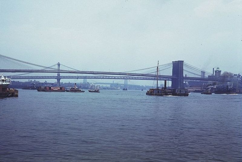 布魯克林大橋(Brooklyn Bridge)跨越在東河(East River)連接布魯克林(Brooklyn)和曼哈頓(Manhattan)兩區。(1941年6月6日,紐約)