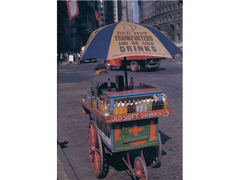 曼哈頓下城區,博靈格林公園(Bowling Green)的軟飲料攤販。(1942年10月1日,紐約)