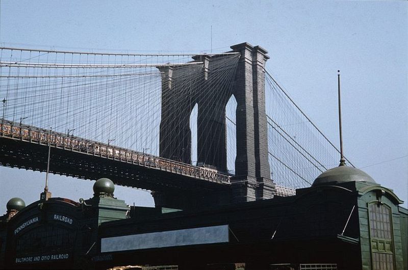 從曼哈頓的南街(South Street)抬頭看到的是布魯克林大橋(Brooklyn Bridge)的橋塔。(1941年9月27日,紐約)