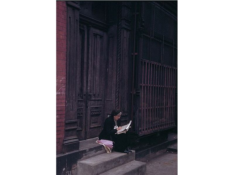 一名女子在下東區(Lower East Side)的家門前看書。(1942年10月某周日的上午,紐約)