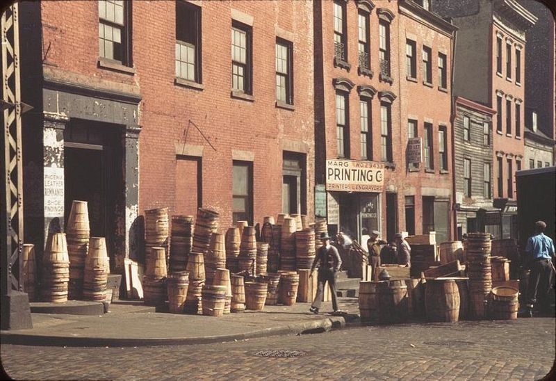 從曼哈頓的南街(South Street)望向富爾頓街(Fulton Street)。(1941年9月27日,紐約)