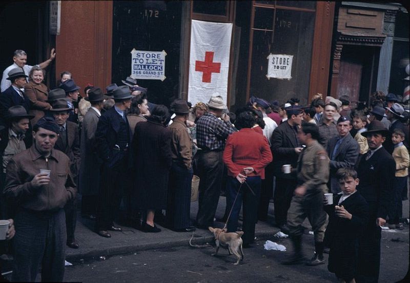 一群人群聚在下東區(Lower East Side)的舊貨收集站。(1942年10月4日,紐約)