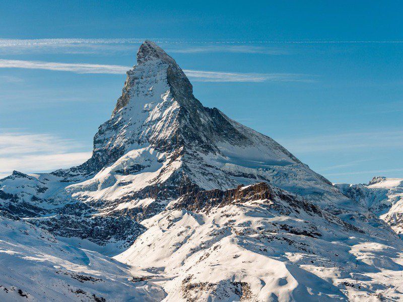 阿爾卑斯山(Alps)最著名的山峰,位於壯麗的策馬特村附近。馬特峰(Matterhorn)在瑞士和意大利之間的邊界上,海拔15,000英尺。這個沒有連外道路的高山村莊,坐落在海拔13,000英尺以上的高度,在冬季時的風景特別迷人。你可以搭乘纜車到山頂,飽覽歐洲最高點的秀麗視野,當然,這裡還有世界級的水療中心,還可以享受滑雪、搭乘馬拉雪橇的機會。