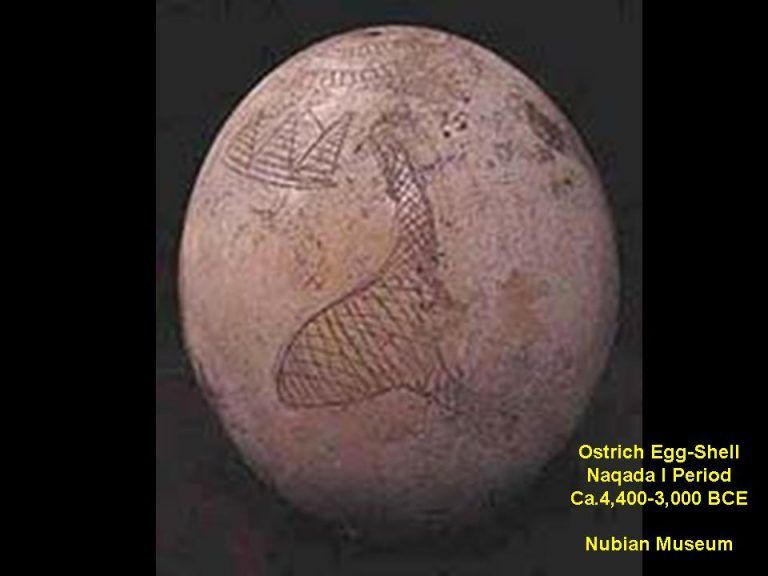 在埃及南部努比亞(Nubia)博物館所保存的鴕鳥蛋就已顯示了古埃及比我們從歷史和考古學所知道的還更古老。這是由英國考古學家馬拉比塞西爾·弗斯(Mallaby Cecil Firth)在1907年所發現到的。那鴕鳥蛋上有著許多圖案,並被存放在墓葬里。在蛋的一邊有著植物和鴕鳥的圖案,而在另一邊則有著吉薩金字塔的圖案。