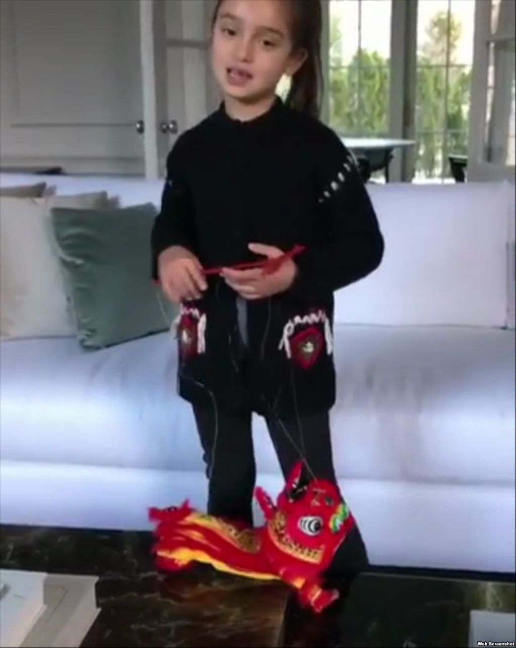 數據顯示,有1930萬人觀看川普總統的外孫女,5歲的阿拉貝拉·庫什納手拿中國傳統的牽線獅子玩偶,唱中文兒歌《新年好》的視頻。