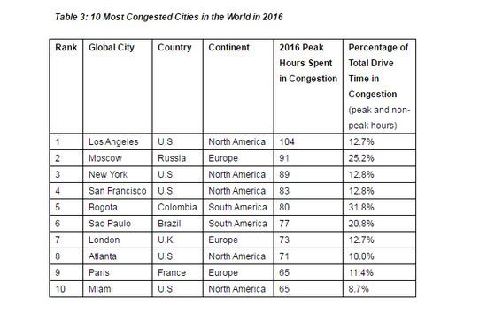 洛杉磯民眾堵車時間一年平均值達104小時,大幅度高於莫斯科的91小時,以及紐約89小時。
