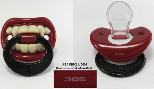 除了上面提到的玩具球,還有一種嬰幼兒撫慰橡皮奶嘴也上了召回名單,加拿大的寶媽寶爸們可要注意了!被召回的奶嘴為Billy-Bob Little Vampire Pacifier,如圖所示,奶嘴包含一個黑色塑料環,還有紅唇帶牙齒形狀的底座,奶嘴為透明橡膠材料。此款Little Vampire奶嘴商品條碼為658890900766,批次號為531HKCHBB2。