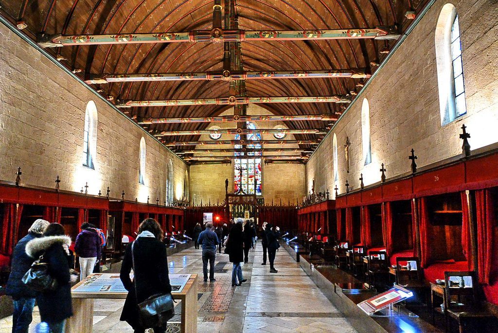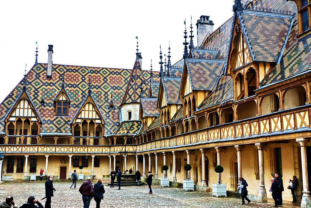 Beaune博訥城本身也非常好玩。城裏最主要的景點是這座中世紀的醫院,叫做Hotel Dieu,法語中的hotel不是旅館的意思,是大廈的意思。這座醫院建於百年戰爭之後,文藝複興之前的中世紀晚期,由當地諸侯建立,修女們管理,窮人看病住院完全免費。這種華麗的琉璃瓦大花屋頂叫做“勃艮第式”。