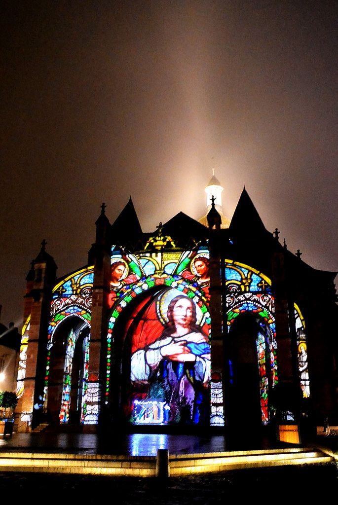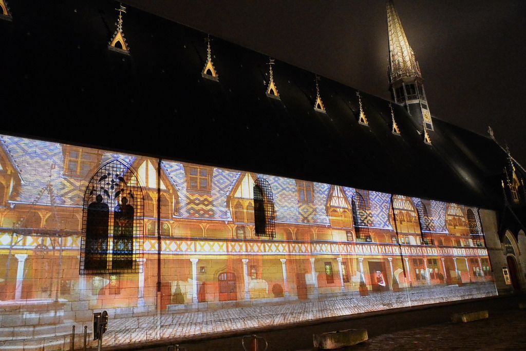 入夜的Beaune更美,在醫院外牆和本地大教堂的外牆上,都用彩燈投影出不斷變幻的各種圖案,有花卉,有名畫,還有中世紀醫院的風景照片。