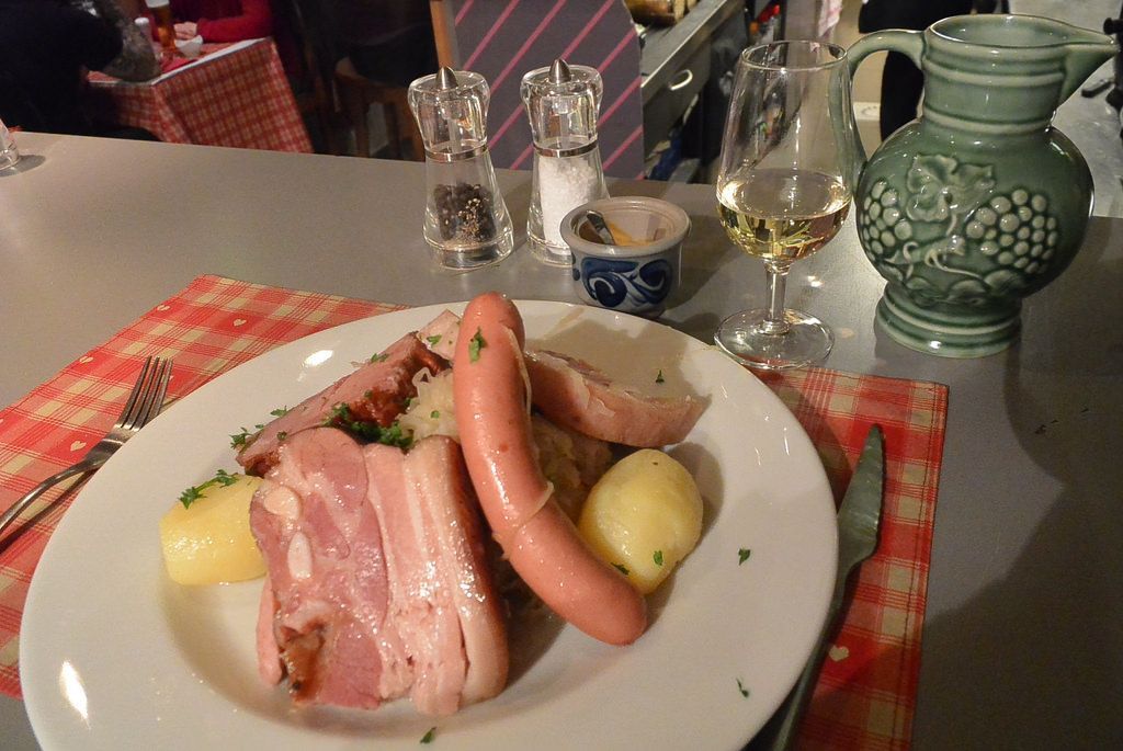 再推薦一家便宜好吃的小餐館,在上圖市中心廣場旁邊,Merchant路 Rue des Marchands 17號,名叫La Soi,門臉很小,周三不營業,是夫妻小店,隻有5張桌子,做阿爾薩斯當地特色菜,就像我吃的這一頓,叫做Baeckeoffe,用陶罐做的豬肉亂燉,典型的德國風格(或者說中國東北菜風格):土豆、酸菜、豬肉肉排,各種香腸。再來一陶罐當地的白葡萄酒。