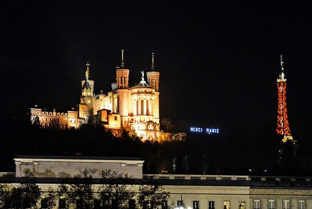 裏昂山頂的聖母教堂其實年代並不久遠,和巴黎聖心教堂一樣,是1870年普法戰爭以後的建築,因為有現代工程機械,所以可以做得非常華麗繁複。不過這些現代的教堂和古代教堂真的沒有可比性。從聖母教堂背後的大平台上還可以俯瞰整個裏昂城。這是夜裏從裏昂市中心仰望山上的夜景。
