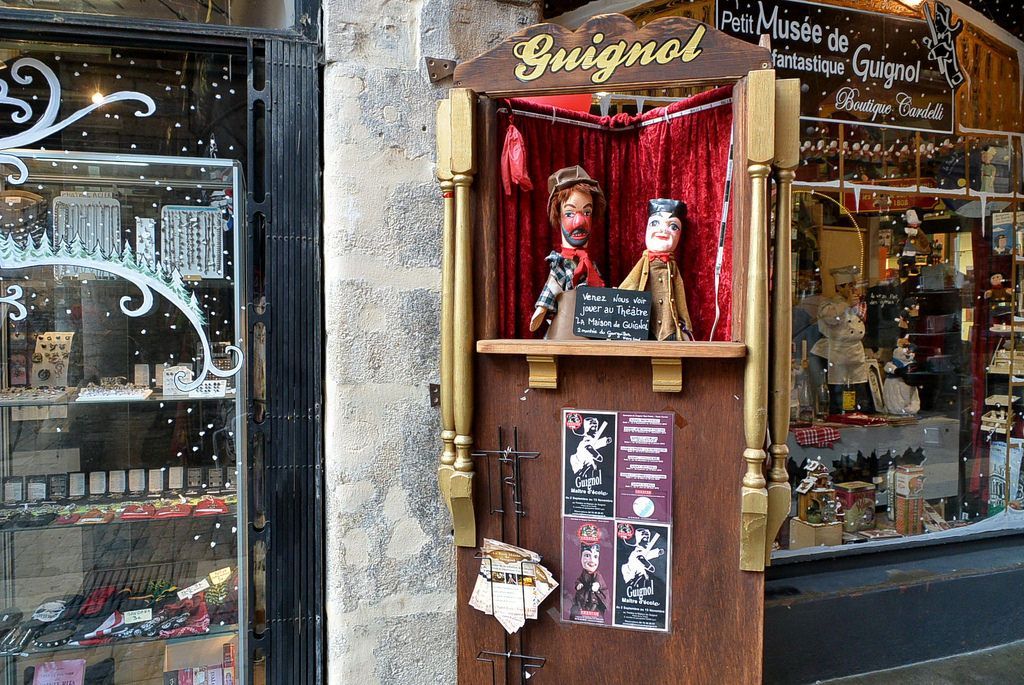 其實裏昂好玩的地方倒不在山上的教堂,而在山下Saone河兩邊,老街新城逛街。裏昂老街上的店鋪各有特色,賣的東西有自己的主題,幾乎沒有重複,更沒有千篇一律,很吸引人。這是街上的木偶戲玩偶。這種法國玩偶劇是有傳統的,也是重要的非物質文化遺產,就像我們的皮影戲。大家記不記得電影《虎口脫險》?裏麵女主角就是這種玩偶劇的演員,劇團還掩護了英國飛行員