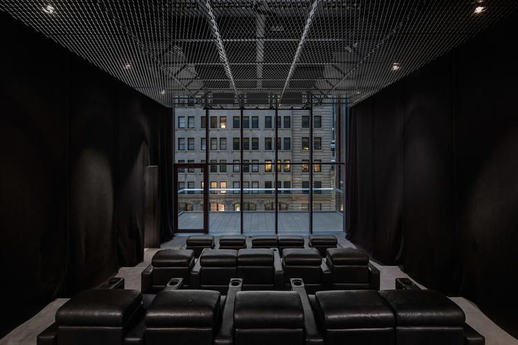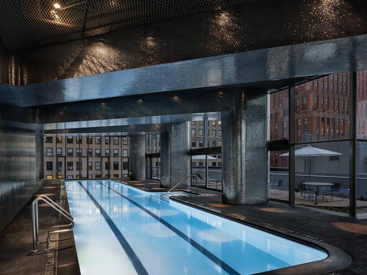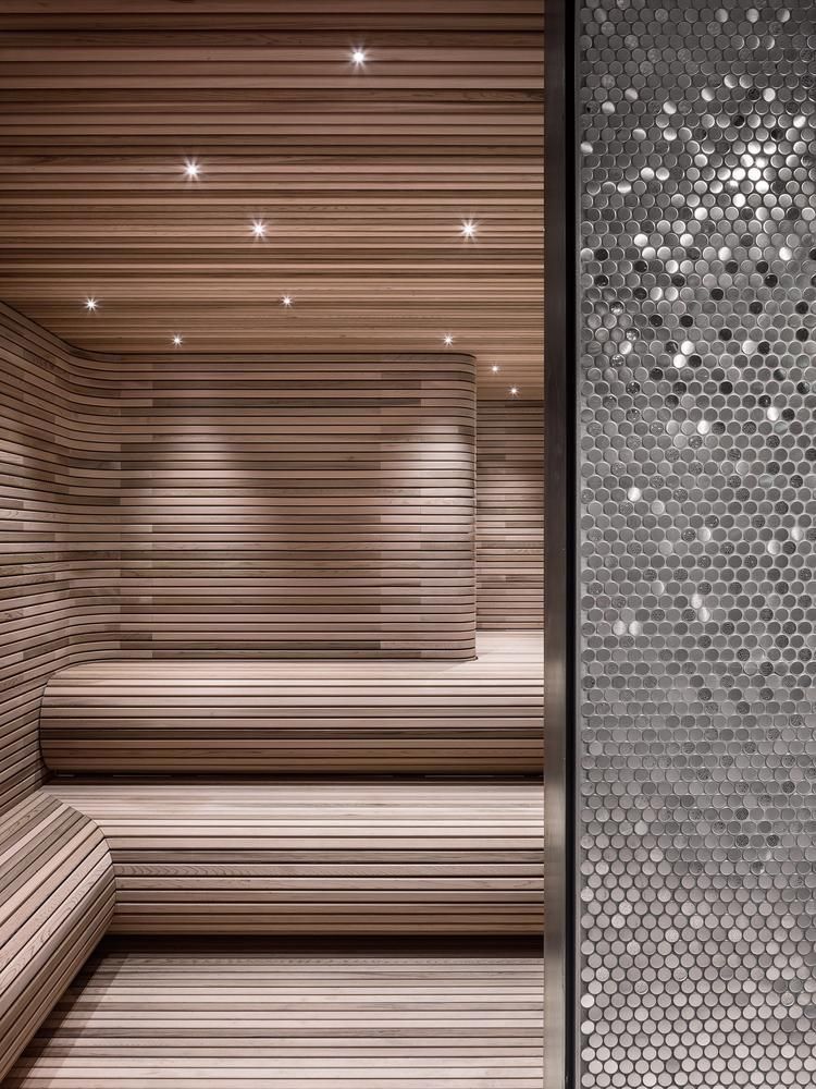 室內遊泳池所在的空間設計得低調又別致。牆壁、支柱和天花板上都用帶有金屬光澤的瓷磚做了裝飾,在懸掛於金屬網之上的 LED 燈的照射下,整個房間有了一種微微閃亮的效果。這兩層空間中,還有一處健身中心,裏麵有瑜伽室和一間用細木條裝飾起來的蒸汽房。人們還可以到擺放著黑色皮沙發的室內劇場看劇,也可以使用閱覽室、餐廳、廚房、會議中心和兒童玩樂區等設施。