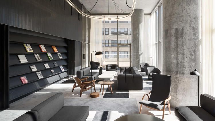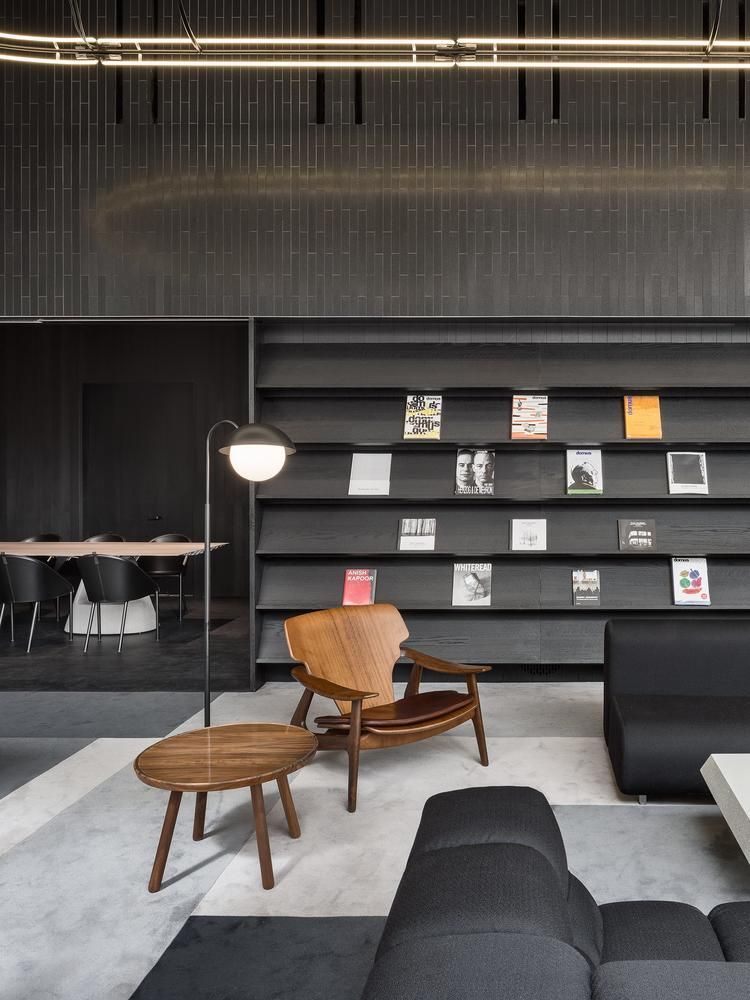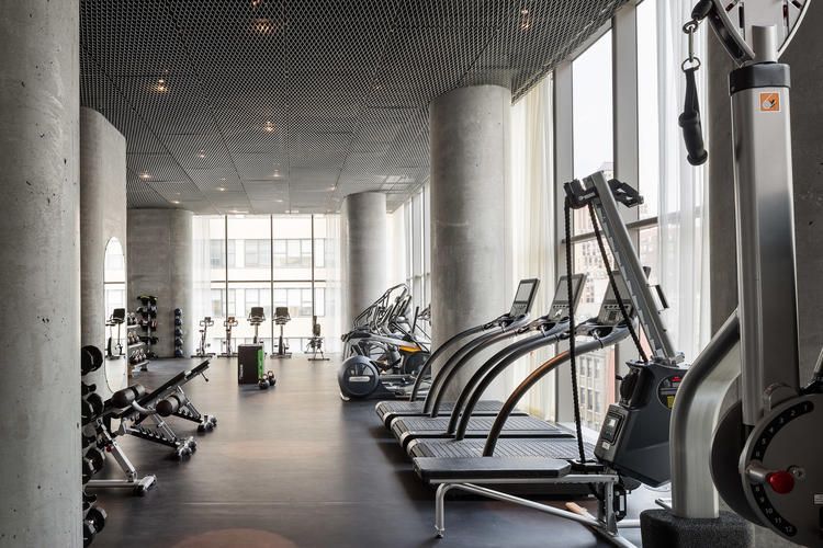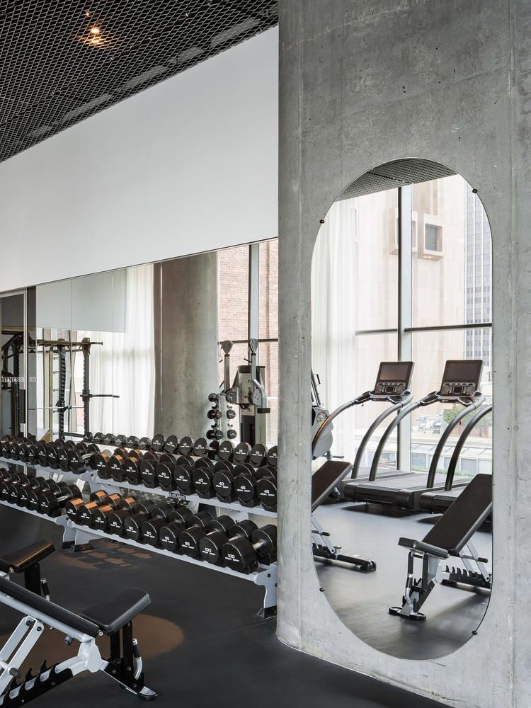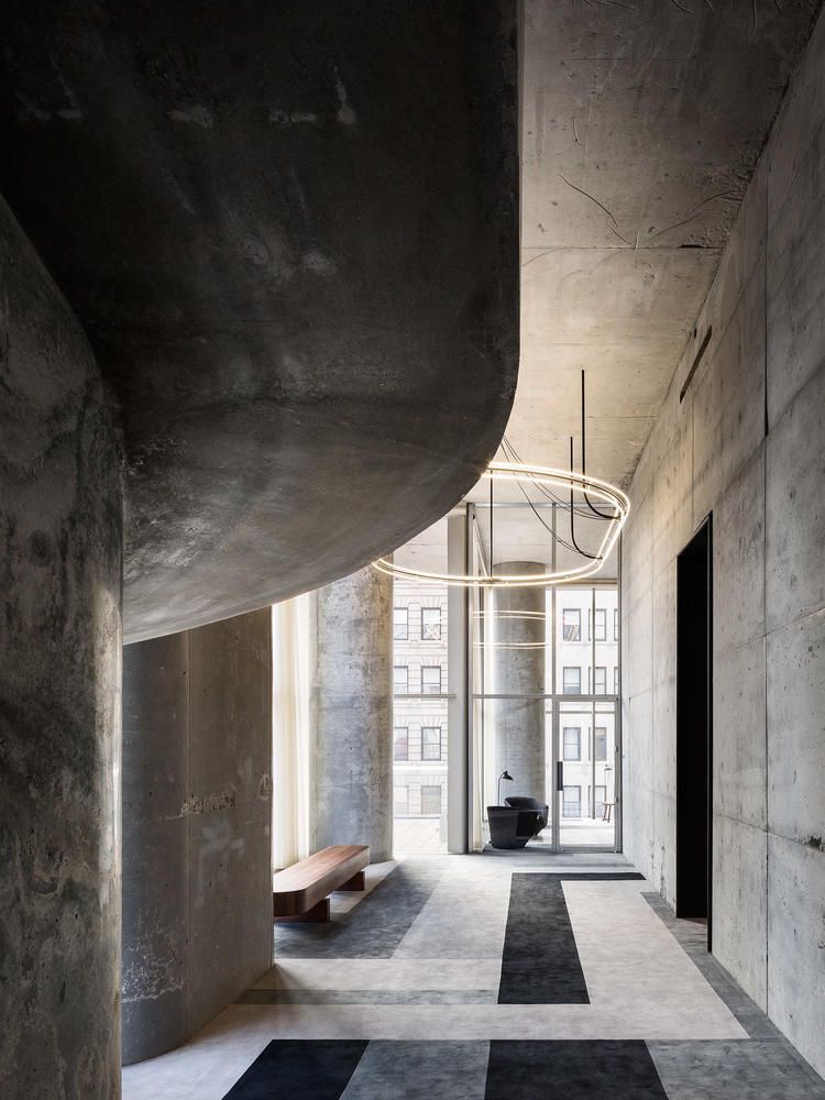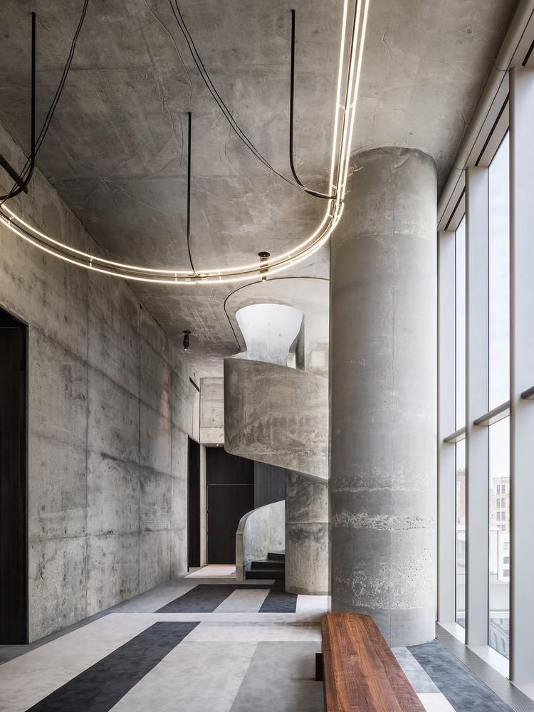 而至於室內設計,目前公布的實景圖,來自位於第九、第十層開放給住戶的共享活動空間。混凝土作為主要的材料,貫穿在兩層空間之中。通過那些粗壯的混凝土支柱與厚實的牆體,人們可以了解這棟建築的結構設計。