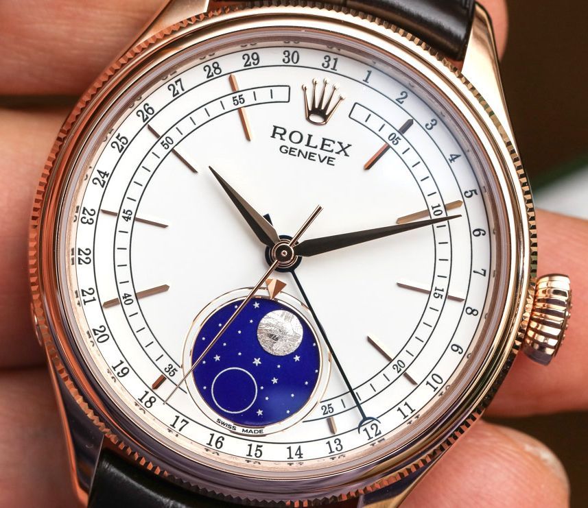 勞力士CELLINI系列的2017新款月相腕錶(型號50535),以玫瑰金的錶殼與指針,搭配迷人的藍色琺瑯月相盤,來顯示月亮的盈虧變化,特別的是,滿月是以隕石為象徵,新月則以銀環代表。本表款也獲得勞力士頂級天文台認證,證明其品質超越製錶業的常規和水平。