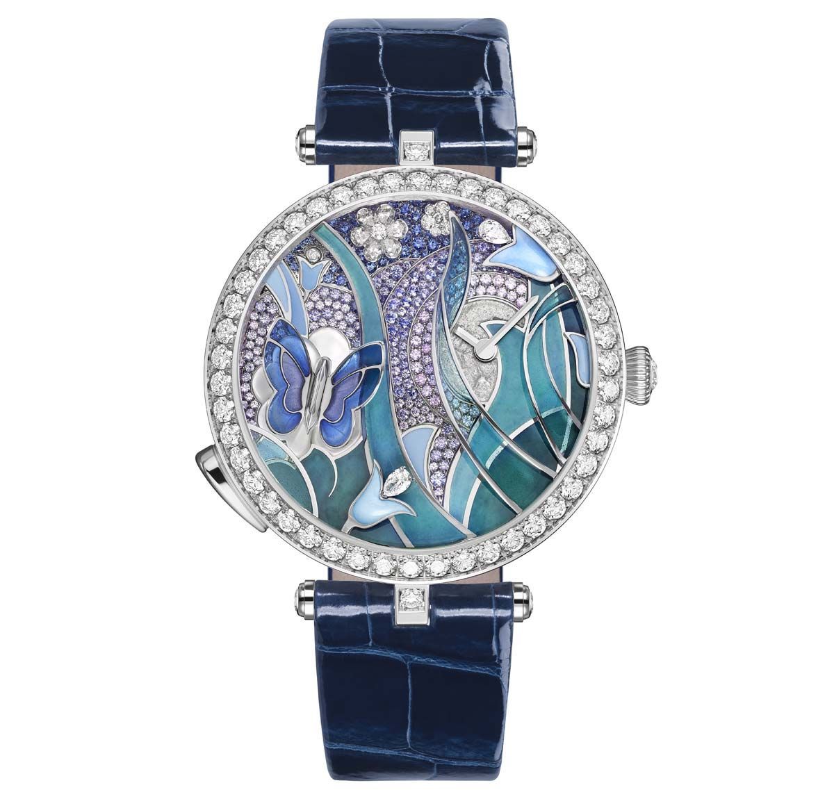 Van Cleef & Arpels梵克雅寶的腕錶均敘述充滿恩典、幸運或幸福的時刻,2017年推出的Lady Arpels Papillon Automate腕錶,將蝴蝶翩翩飛舞的動作,融入如詩如畫的田園景致中,再次以嶄新的方式呈現時光流逝,與如夢似幻的和諧之美。每只腕錶既是藝術,也是經典。