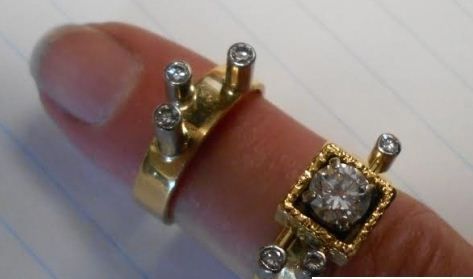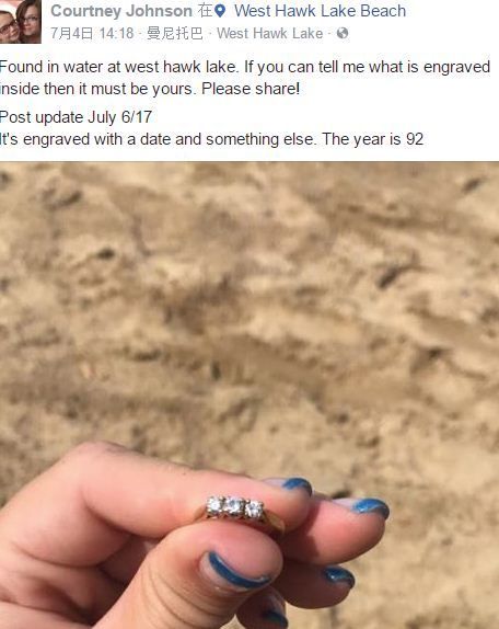 CourtneyJohnson說,當時她的男友正從湖中走上岸,因為有很多尖尖的石頭,所以一直頭朝下看。結果一眼就看到這枚鑲有三顆鑽石的金戒指,於是便撿了起來。