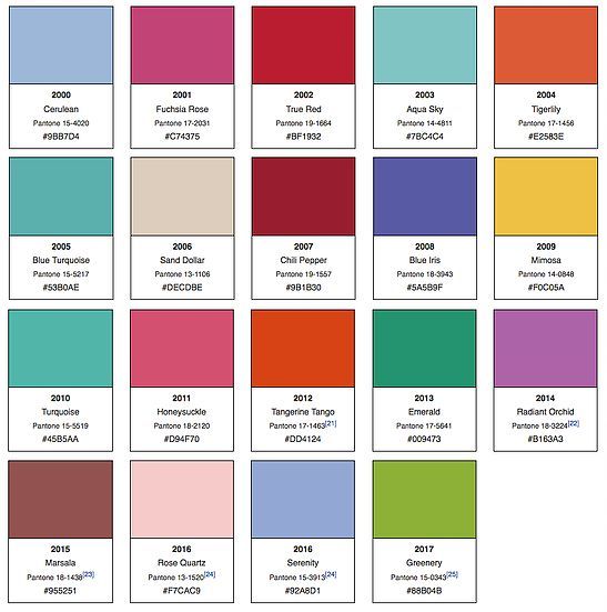 從2000年開始,彩通(Pantone) 集團下的色彩研究所(the Pantone Color Institute) 陸續公布每一年的代表色。來自全球色彩標準業界相關的與會人士,在每年兩次於歐洲某地的秘密會議討論之後,也綜觀考量年度的全球社經狀況、時勢潮流等因素,一起選出來年的關鍵主色。彩通是全球色彩權威指標,其年度代表色也成為新聞及社群網路上的潮流話題。