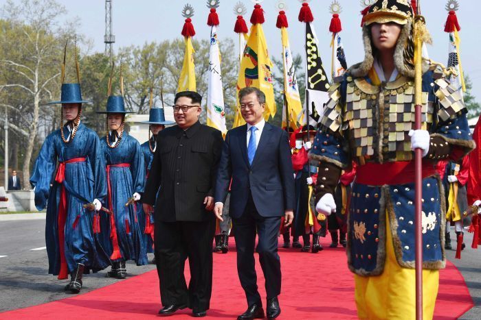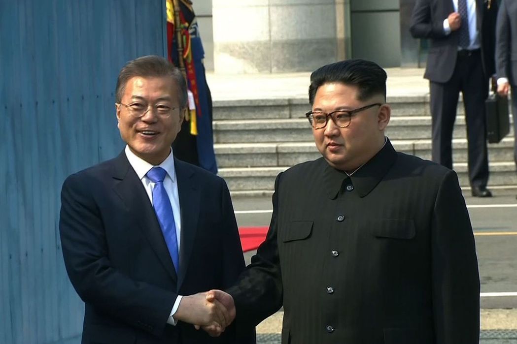 文在寅和金正恩27日上午各站在分界線一端握手,文在寅和金正恩分別邀對方跨越分界線。金正恩先跨線到南韓,接著文在寅再跨線到北韓,最後兩人一起跨線走向南韓。兩人走在紅毯上時,南韓也特別安排穿著古代傳統服飾的儀仗隊伍與演奏傳統音樂來歡迎。