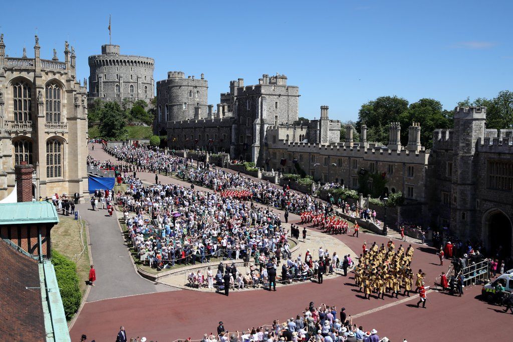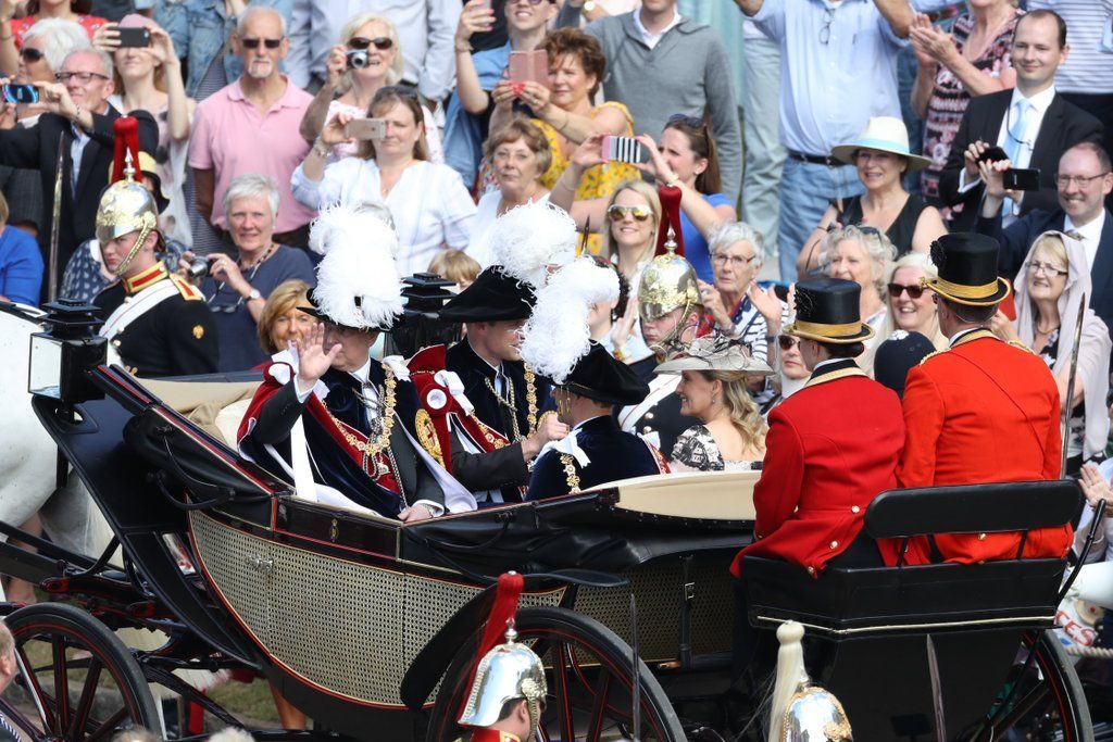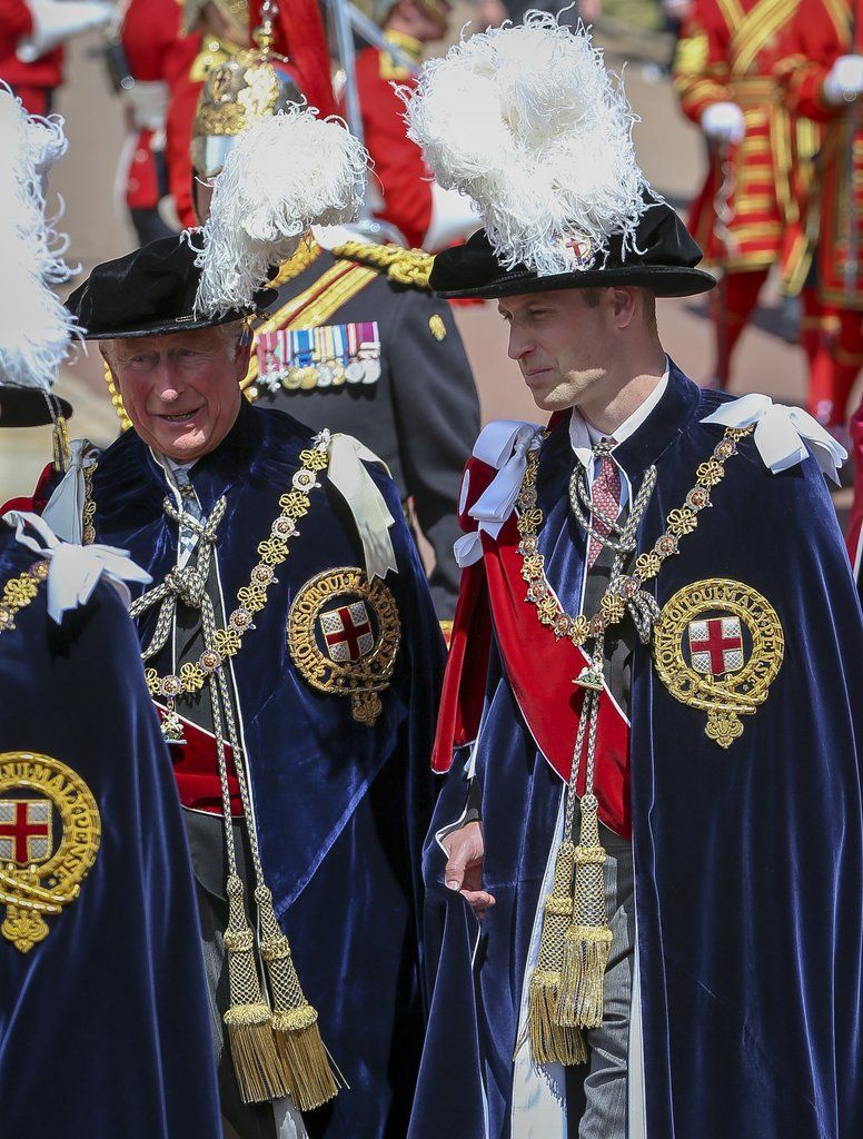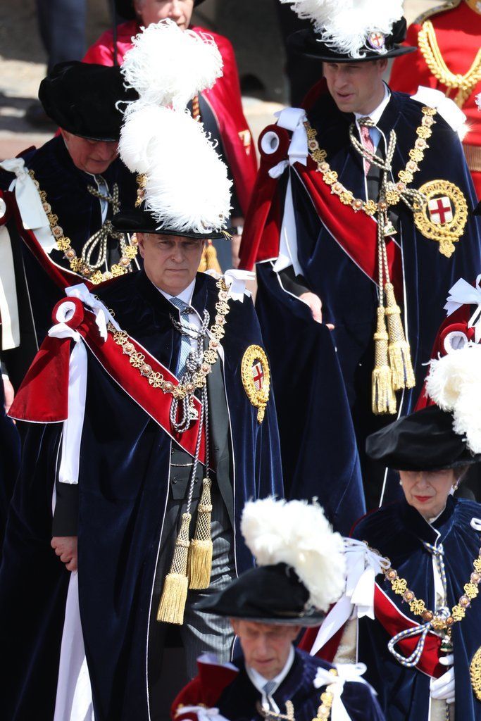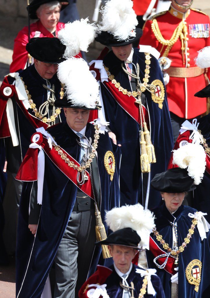这一天既是王室的大日子,也是嘉德骑士们的重要纪念日。所有嘉德骑士均穿深蓝色天鹅绒长披风(王室成员的披风有拖摆),头戴黑色天鹅绒帽,帽上配有白色鸵鸟和黑色苍鹭的羽毛。
