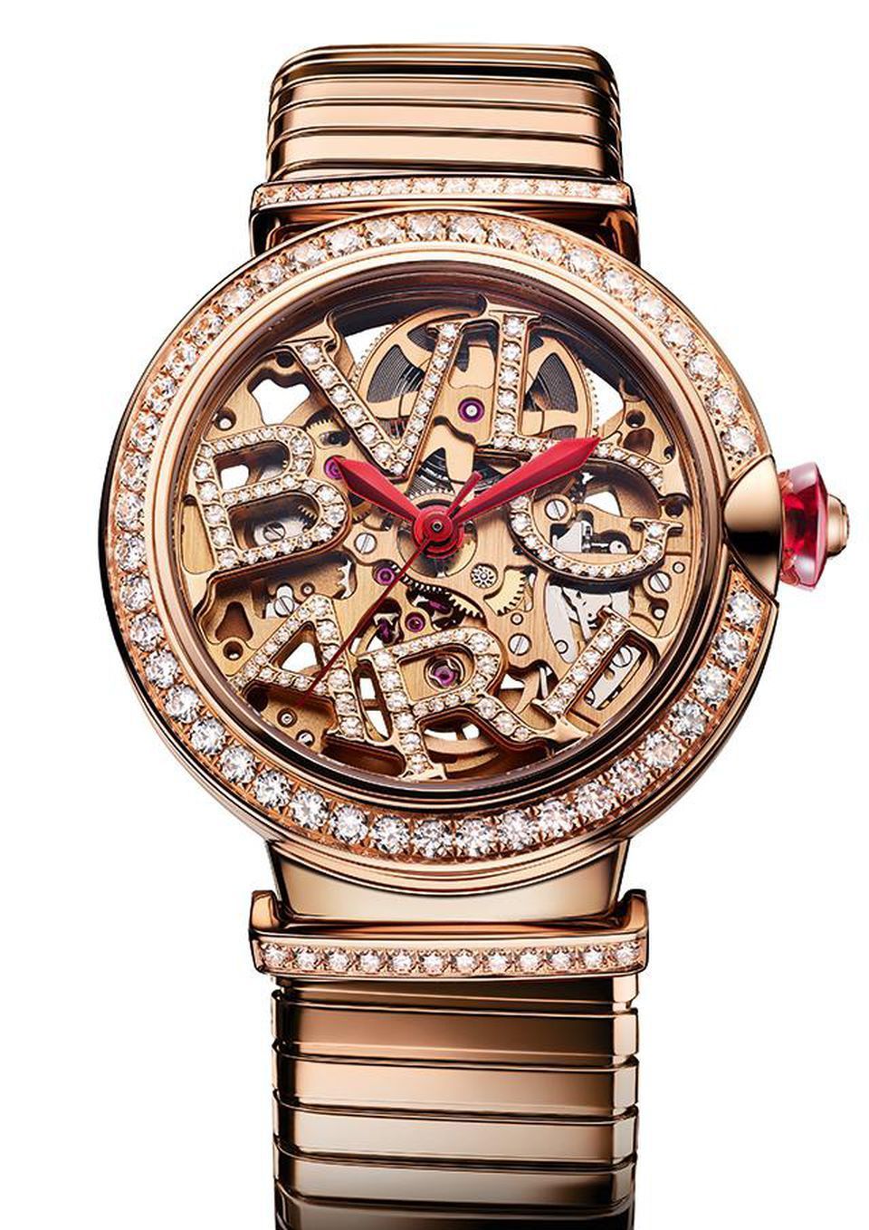 Bulgari喜歡以創造性的方式將其標誌放在手錶上,使其成為設計的一部分。Lucea Skeleton通過雕刻展示品牌名稱的方式來展示機芯。BVL 191自動骨架機芯採用手工雕刻和鑽石鑲嵌設計。彩色指針是紅色,與皇冠上的紅色圓形相配。Lucea系列最初於2014年推出,其名稱取自意大利語中的「light」字樣。
