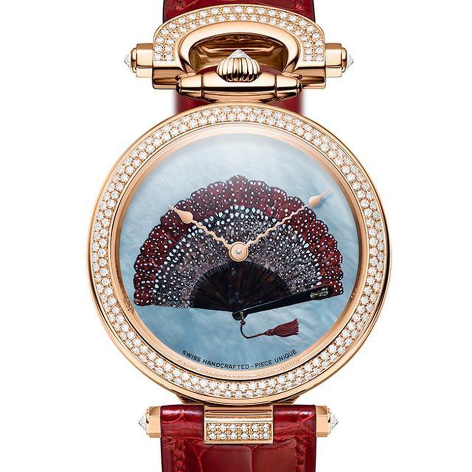 Bovet 1822製作了一系列基於扇形圖案的女士腕錶,每一件都是獨一無二的,採用各種材料和元素,包括羽毛、絲綢、蕾絲、鑲嵌珍珠母和微型琺瑯彩繪。這個錶盤上的扇形是在珍珠母錶盤上手繪的。它是一款可轉換的獨特單品:它可以轉換成手錶、桌鐘或吊墜。