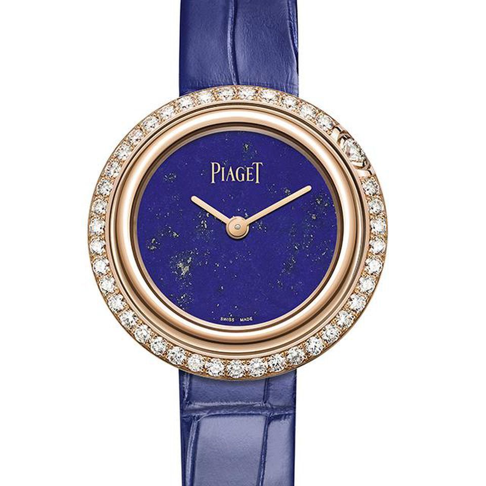 這款18k金件的獨特之處在於它採用了可以由佩戴者轉動的旋轉外圈,就像一個鑲有鑽石的小巧旋轉器。Piaget將這一概念應用於整個Possession系列,旋轉表圈和礦物錶盤——這是青金石。該系列旨在與Possession珠寶系列兼容,錶盤與珠寶中的寶石相匹配。