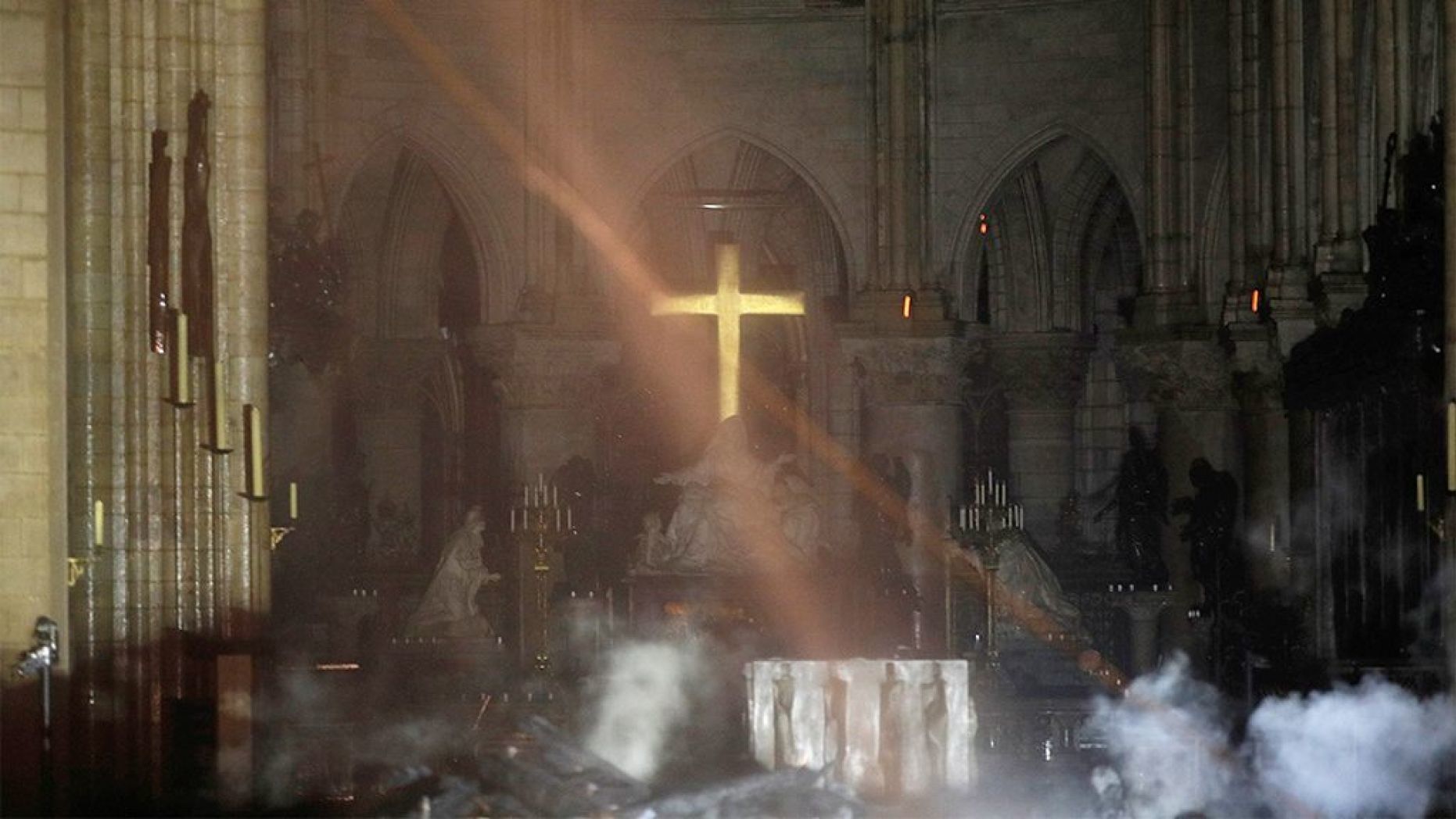 在不斷上升的煙霧和廢墟中,當消防隊員進入遭受火災蹂躪的大教堂探測損壞時,看到金色的祭壇十字架發光。