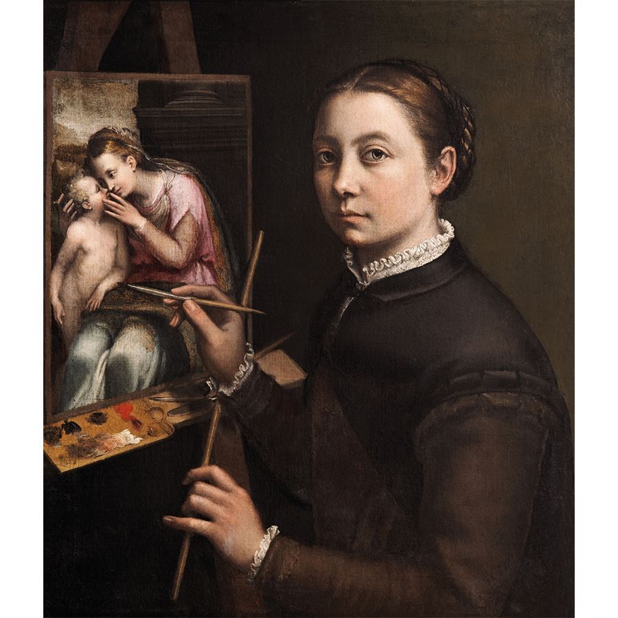 安吉索拉(Sofonisba Anguissola, 約1535–1625年)生在意大利北部的克雷莫納(Cremona),成長於一個龐大的少數族裔家庭,她在11歲時開始學畫。她畫的自畫像比以前的任何女畫家都多,並且使用周邊的物品,如木頭、銅塊、帆布和撲克牌,以確立其藝術風格。無論是繪畫、讀書、祈禱,還是扮演處女,安吉索拉的自畫像都展現出一個聰明、有修養的年輕美女,美麗但謙虛。她的父親將她的畫作送給當地貴族、米開朗基羅、克洛維奧(Giulio Clovio)等著名藝術家,除了提升女兒的才華,並且藉此尋求有利的婚姻。前者於1559年獲得回報,安吉索拉受邀成為西班牙費利佩二世(Felipe II, 1527-1598)續弦瓦洛瓦皇后(Queen Isabel de Valois, 1545-1568)的侍女。