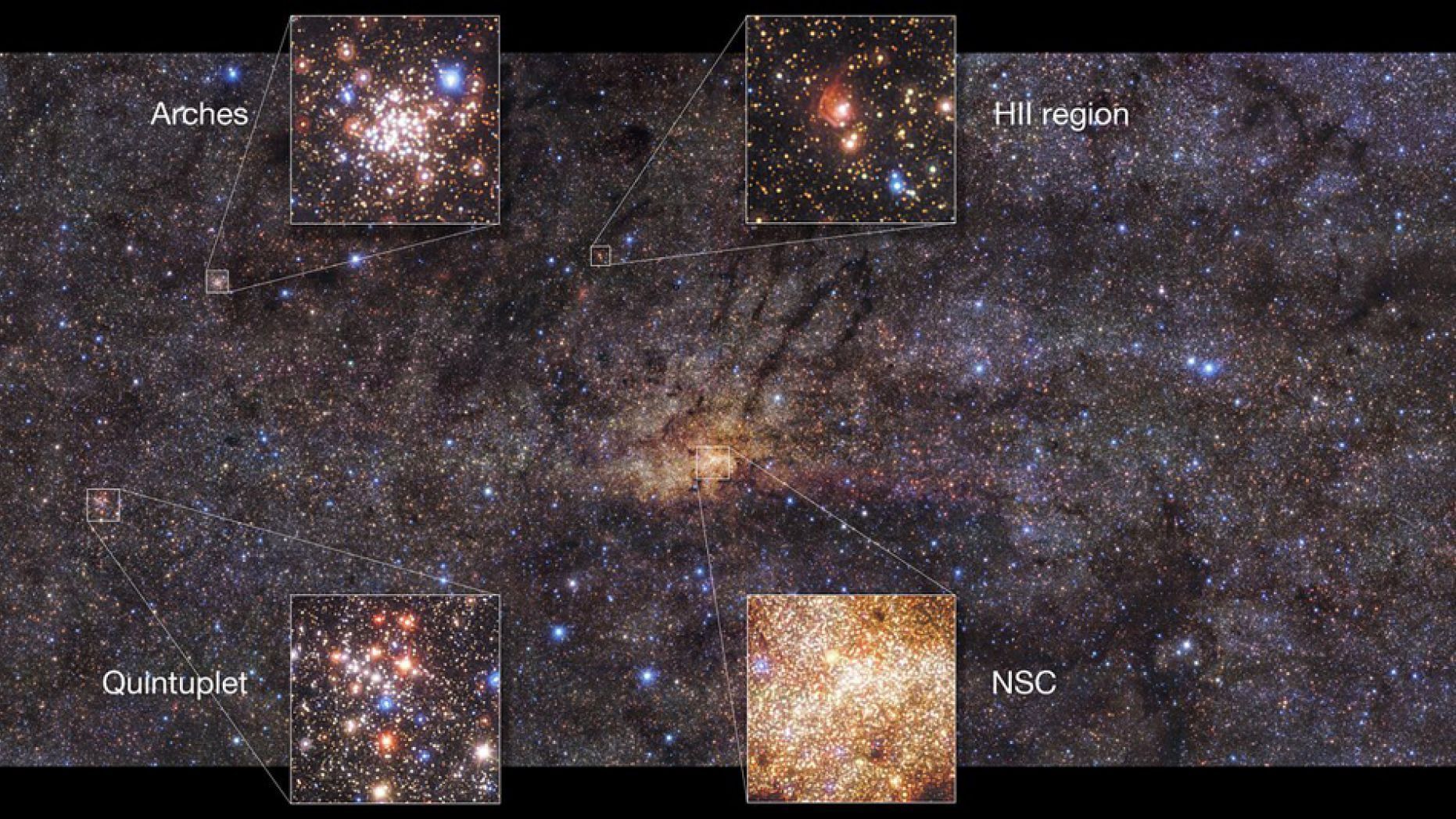 用歐洲南方天文台超大型望遠鏡上的HAWK-I所拍攝的這張美麗的銀河系中心區域圖像,顯示了我們銀河系的這部分的有趣特徵。此圖突顯了中央的核星團(NSC)和銀河系中最密集的星團――拱門團。其他特徵包括五重星團,擁有了五個突出的恆星,以及一個離子化氫氣(HII)區域。