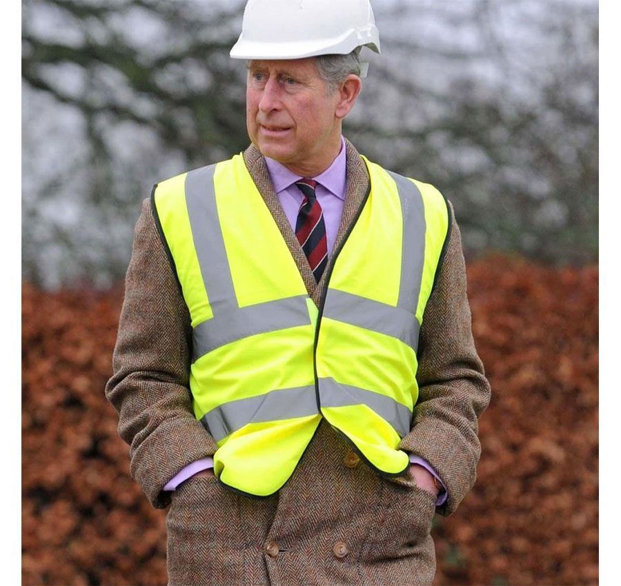 2008年2月22日:查爾斯王子穿戴著保護性背心和頭盔,參觀Llwynywormwood莊園正在進行的翻新工程。