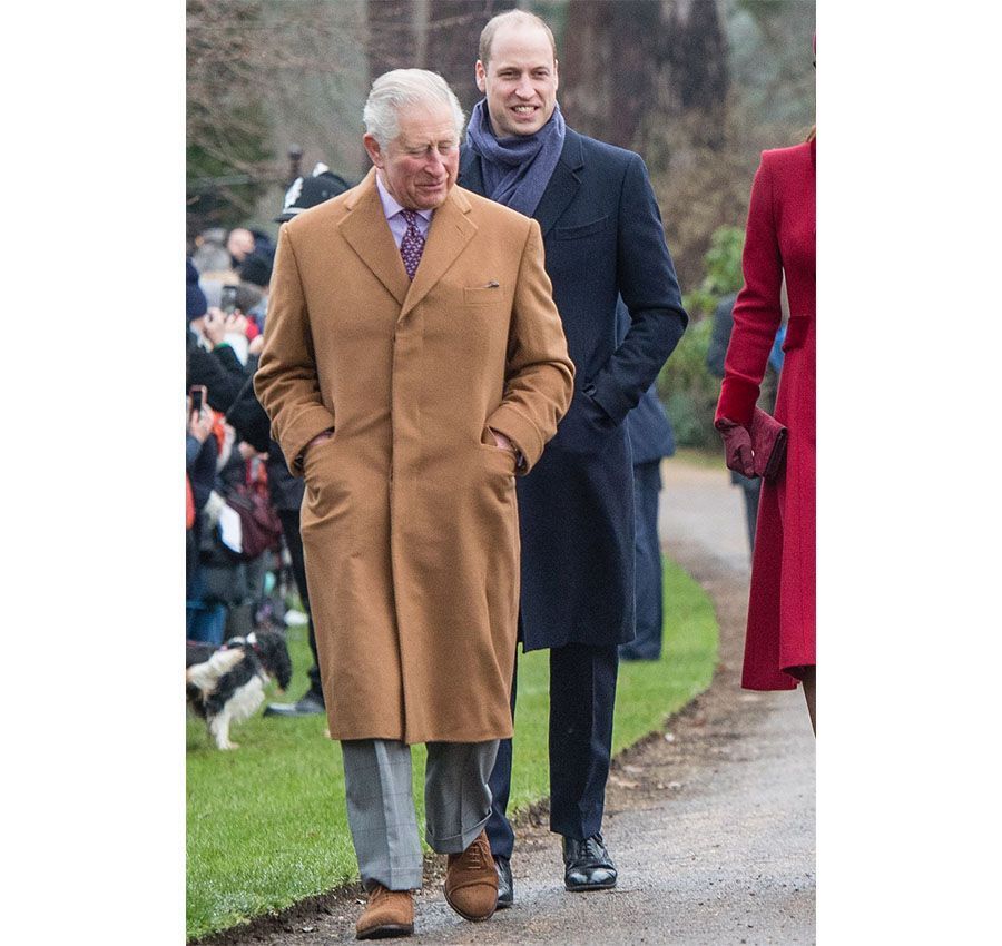 2018年12月25日:聖誕節時,查爾斯王子穿著駝色外套,前往在桑德靈厄姆莊園(the Sandringham estate)的聖瑪麗抹大拉教堂(the Church of St Mary Magdalene)做禮拜。