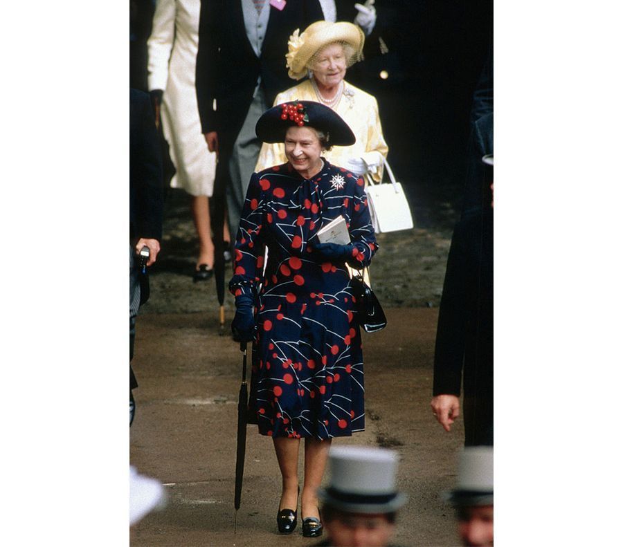 1990年:女王伊麗莎白二世出席賽馬會的服裝圖案題是「櫻桃」。她堅持這個主題,大衣上覆蓋著鮮紅色的櫻桃。身為女王,她用鑽石為飾物,並戴上亡母維多利亞女王的胸針。
