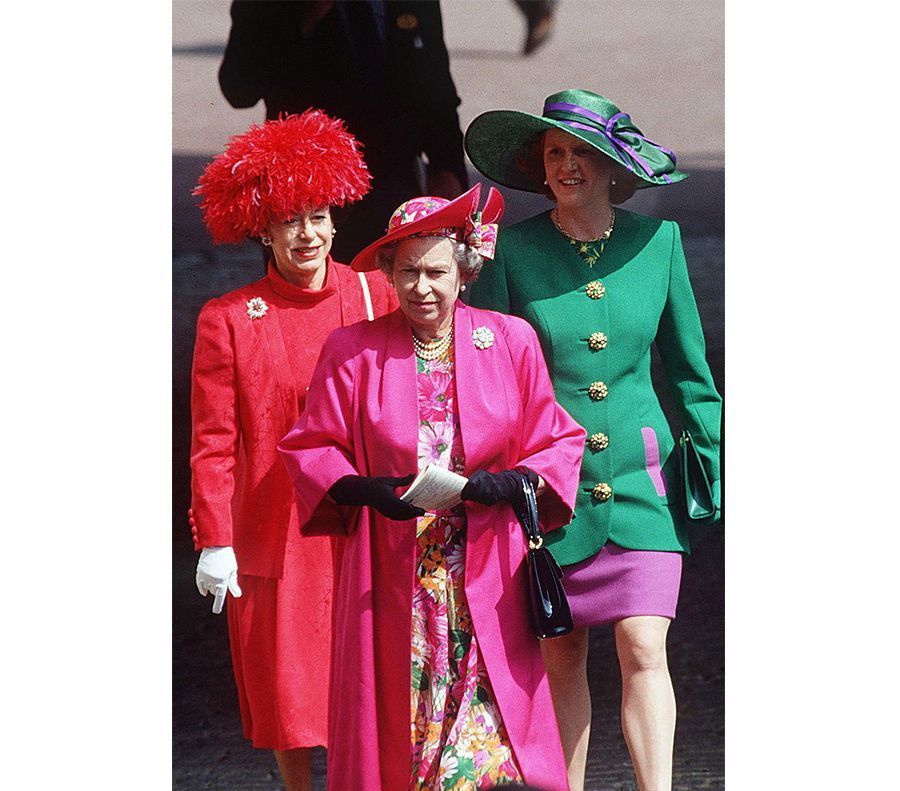 1991年:女王伊麗莎白二世(圖中)與姐姐瑪格麗特公主(圖左)、媳婦約克公爵夫人莎拉(圖右)一起出席皇家阿斯科特賽馬會。三位女士都穿得很漂亮。女王穿著一件粉紅色外套。瑪格麗特公主戴著超大的羽毛帽子。莎拉穿著套裝,搭配軟盤帽子。