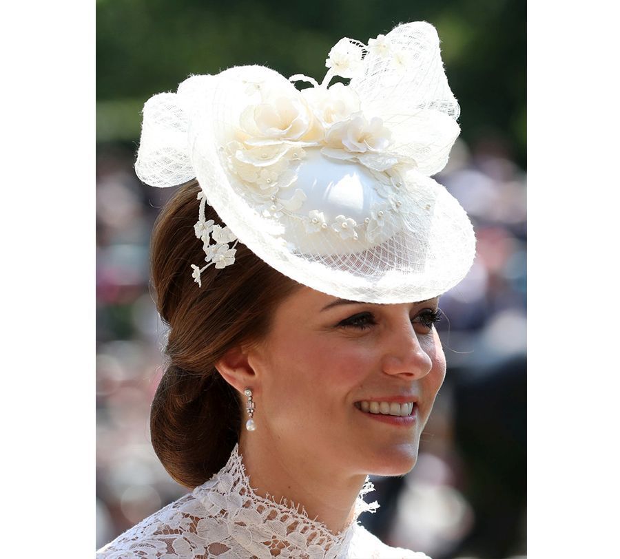 2017年:凱特(Kate Middleton)身穿白色禮服出席皇家阿斯科特賽馬會。她的帽子很簡單,搭配蕾絲和白色花邊,與2016年時與會的穿著很麗似。