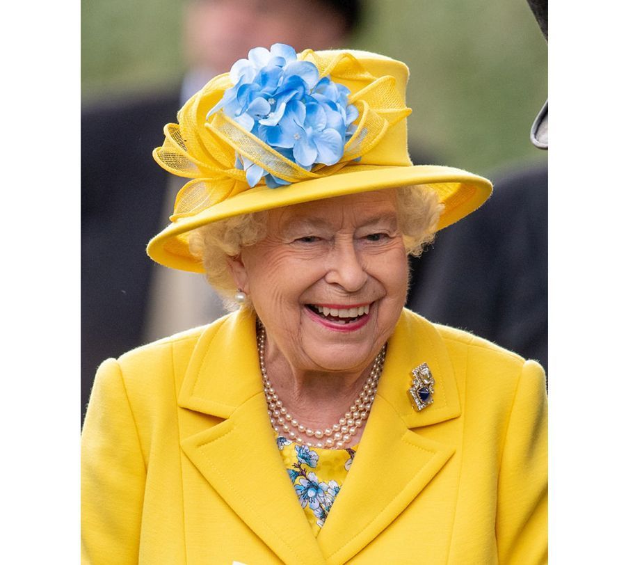 2018年:女王伊麗莎白二世為出席賽馬會選擇黃色帽子、黃色外套和一件花裙。女王的黃色帽子上有透明緞帶和天藍色大花為搭配。