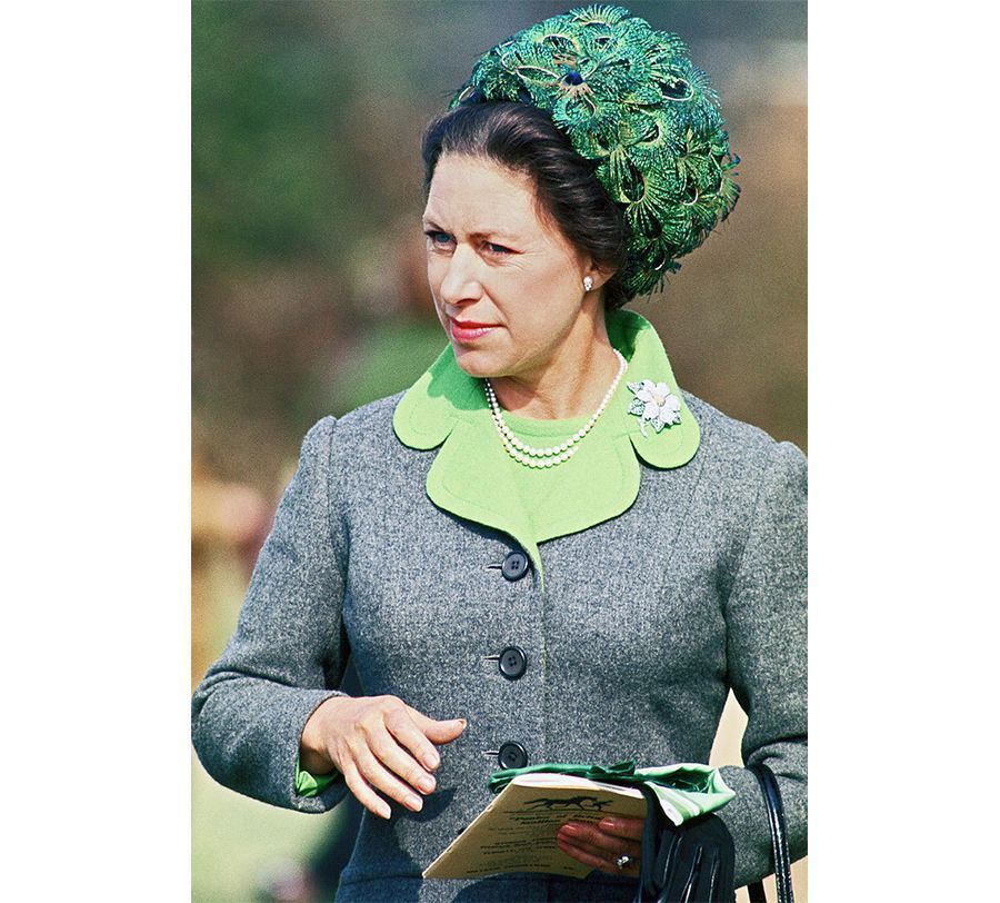 1973年:瑪格麗特公主戴上俏皮的藥盒帽子,上面滿是孔雀羽毛。當其它皇室成員沉迷於阿斯科特風潮時,她通常會選擇更莊重的設計。瑪格麗特公主的孔雀設計仍然很有趣,但絕對不是那年出席人數最多的選擇。