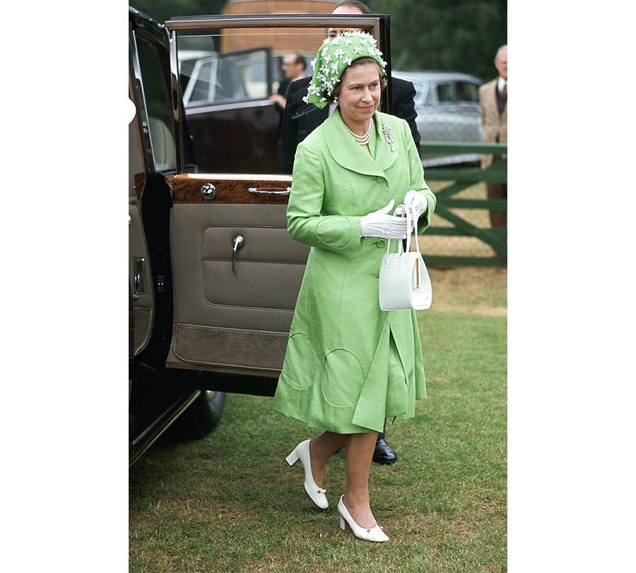 1973年:女王伊麗莎白二世以一身霓虹綠的打扮,在人群中極為突出。她的真絲綠色連衣裙和外套完美地搭配花朵點綴的帽子。