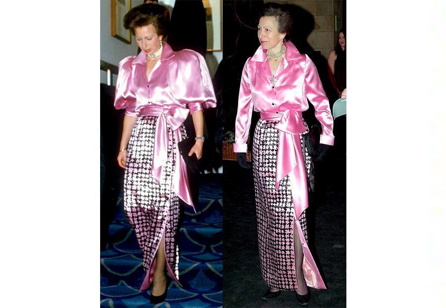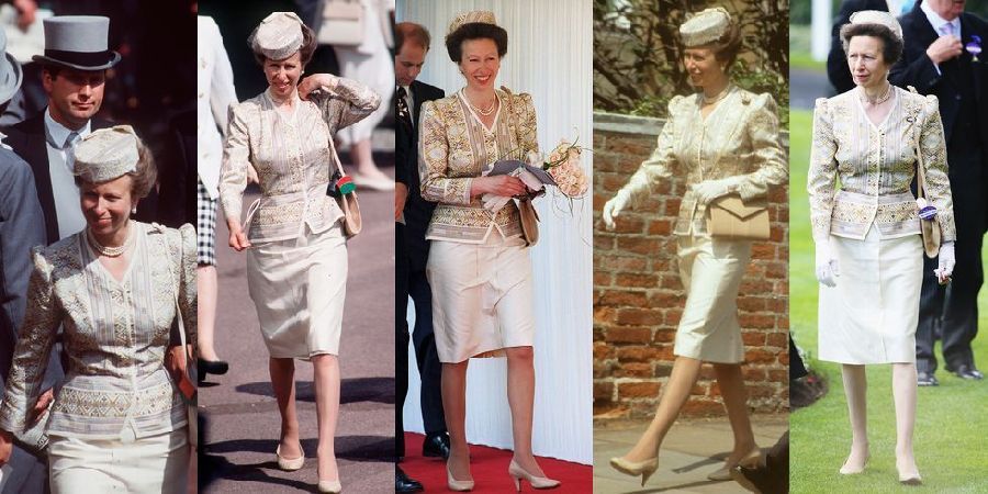 這款米色半身裙套裝搭配西裝外套和帽子,是安妮公主80年代和90年代衣櫥的要角。她不僅在1988年和1994年兩次穿戴它,出席皇家阿斯科特賽馬會(the Royal Ascot),在1995年5月和1997年7月的活動中也都穿著它。經過17年的休息,2014年6月18日,她再次穿著這套裙裝,出現在皇家阿斯科特賽馬會場。
