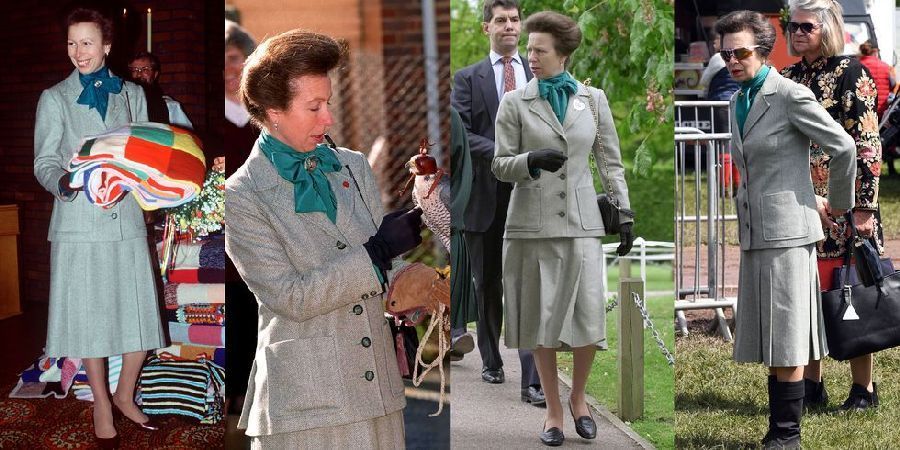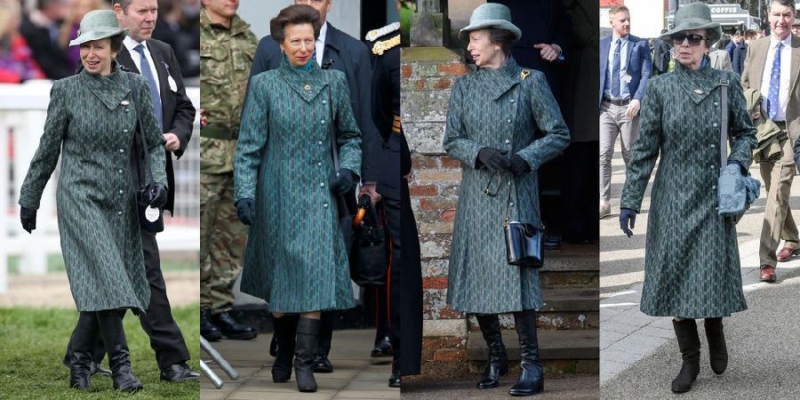 這件綠色外套搭配輕巧的帽子和休閒的靴子表明,安妮公主是王室中頗具冒險精神的成員之一。她首先出現在2012年3月16日的切爾滕納姆音樂節(the Cheltenham Festival)上。第二年,2013年5月24日,出現在英國阿賓登(Abingdon)舉行的阿富汗服役獎(the Afghanistan Operational Service Medals)遊行上。三年後的2016年,安妮公主選它作為聖誕節服裝。她也在2020年3月13日的切爾滕納姆音樂節(the Cheltenham Festival)上穿戴著它。