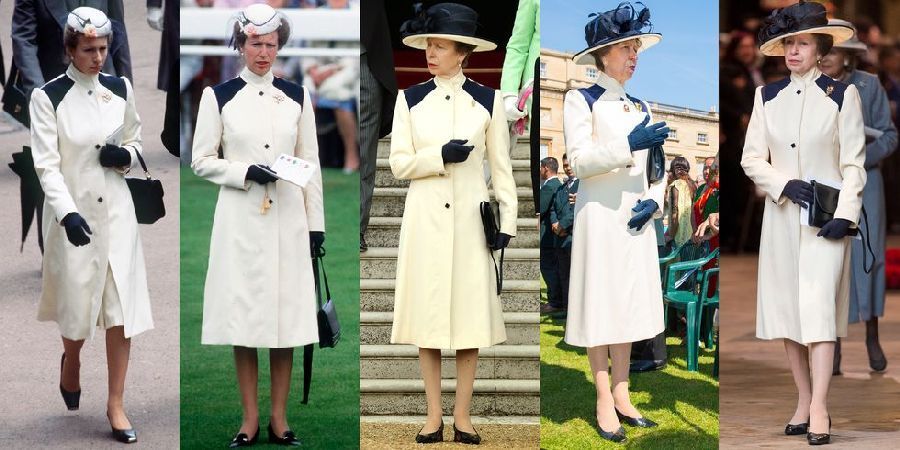 這款奶油色和海軍藍風衣成為安妮公主(Princess Anne)春天赴宴的最愛。它先後出現在1980年6月17日皇家阿斯科特賽馬會上,和1985年6月5日的葉森賽馬會(the Derby at Epsom Downs)上。2015年,安妮公主在兩次穿著它參加白金漢宮的派對,一次是在2015年5月28日,另一次是在2015年6月11日。同樣的服裝,於2018年3月12日英聯邦週年紀念日(the Commonwealth Day),再次出現在威斯敏斯特大教堂(Westminster Abbey)。