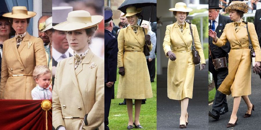 這款淡黃色雙排扣大衣,已經陪安妮公主度過40個年頭了。她在1980年6月14日,首次把它搭配相同顏色的寬邊帽子,出席國慶活動。它在1983年、2007年、2011年、2015年的派對或賽馬會上都出現過。