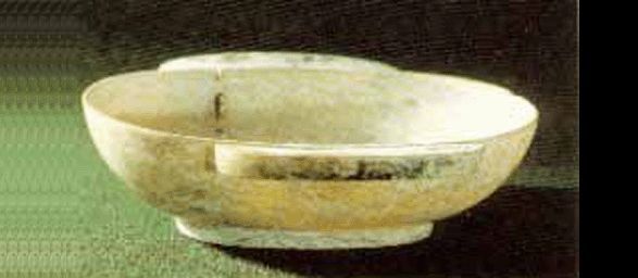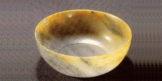 十六国北燕。半灰半黄,满布黑色斑纹。体圆,直口,底略向内收,矮圈足。口沿饰有较粗的凸弦纹和较细的凹弦纹。器体较薄,琢制工细。1965年辽宁北票冯素弗墓出土。现藏辽宁省博物馆。